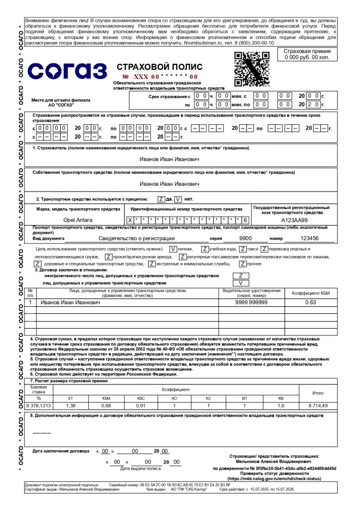 - Расчет страховой премии: базовая ставка, применяемые коэффициенты (территория, мощность, стаж и т.д.) и итоговая сумма к оплате. Этот блок — важное отличие от полисов старого образца.