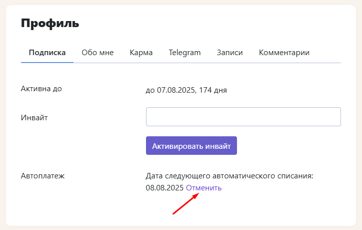 Перейдите в профиль. Если у вас есть запланированное списание, оно появится в разделе «Автоплатеж»
